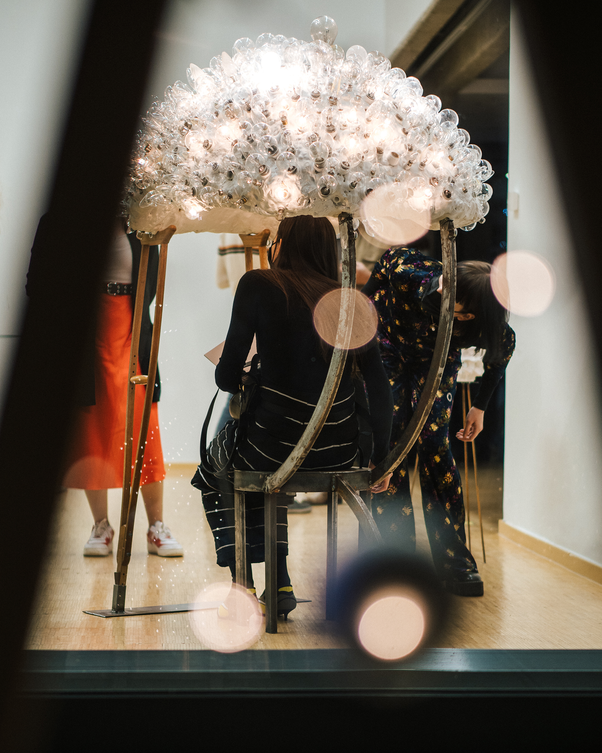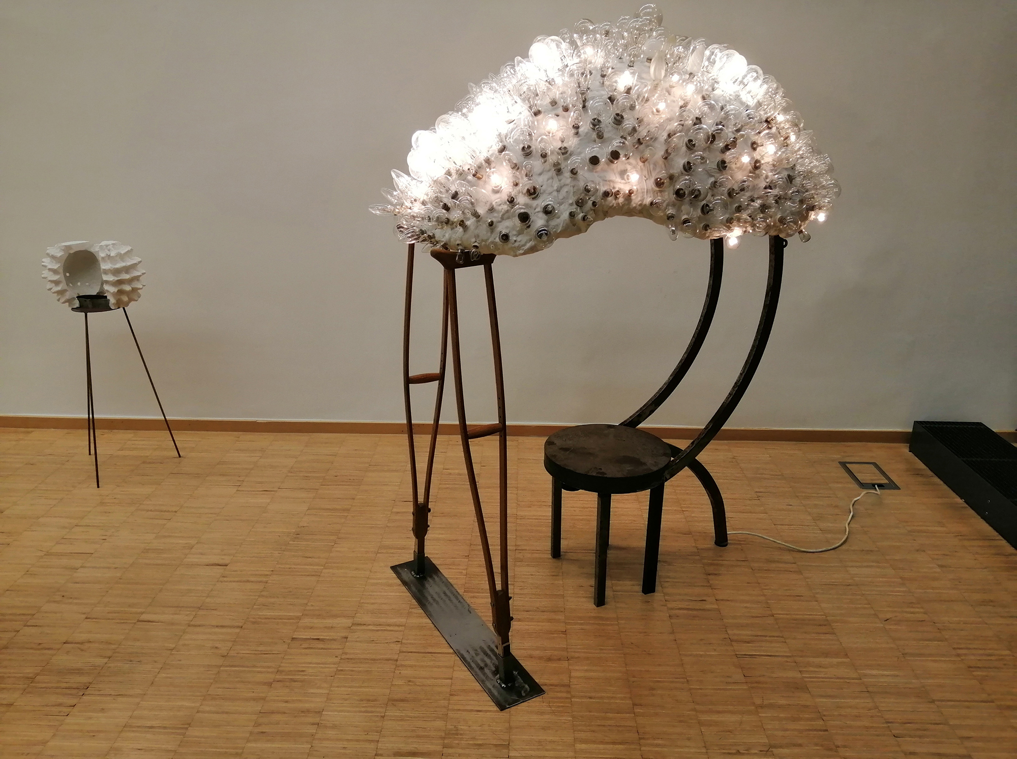 The "Enlightening chamber" is the final piece from the "Clinic for the Self" series. It is a seating made of densely strung glass bulbs of different sizes, which create a magical texture. The lightbulbs gradually lighten up while a person is approaching, coming to its fullest when the visitor sits inside the chamber. Symbolically, the visitor is ready to absorb all the acquired inner wisdom, and the enlightenment process can begin.