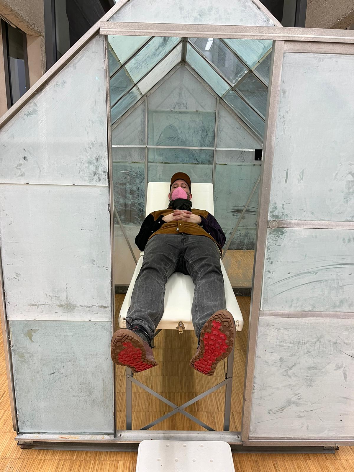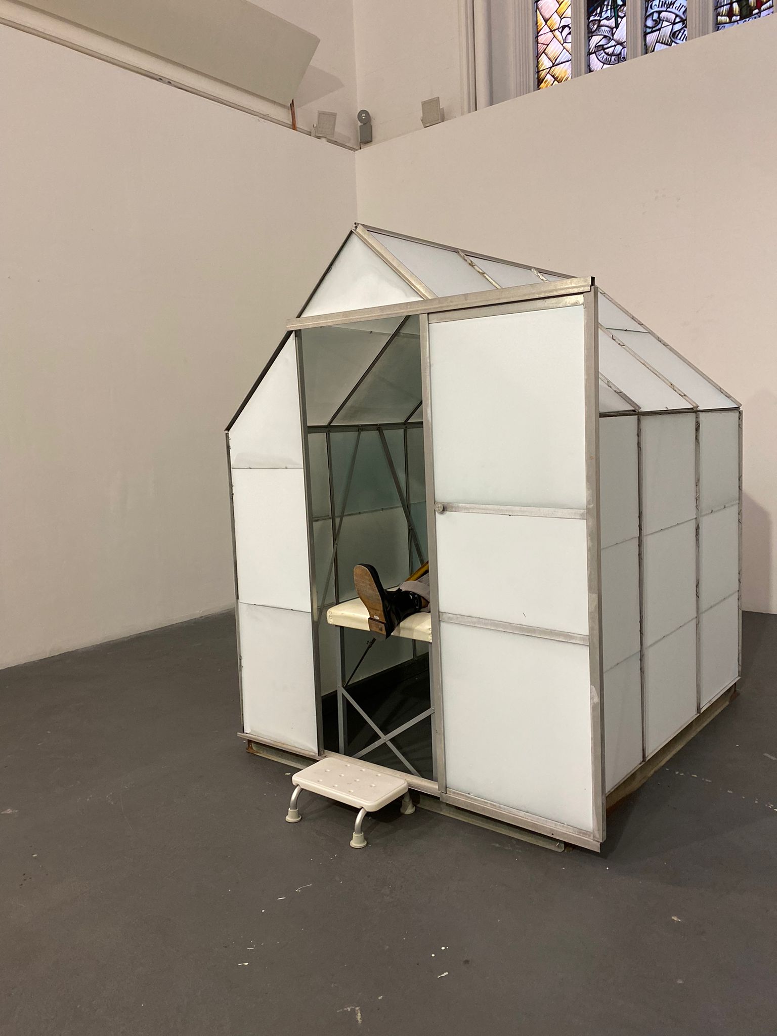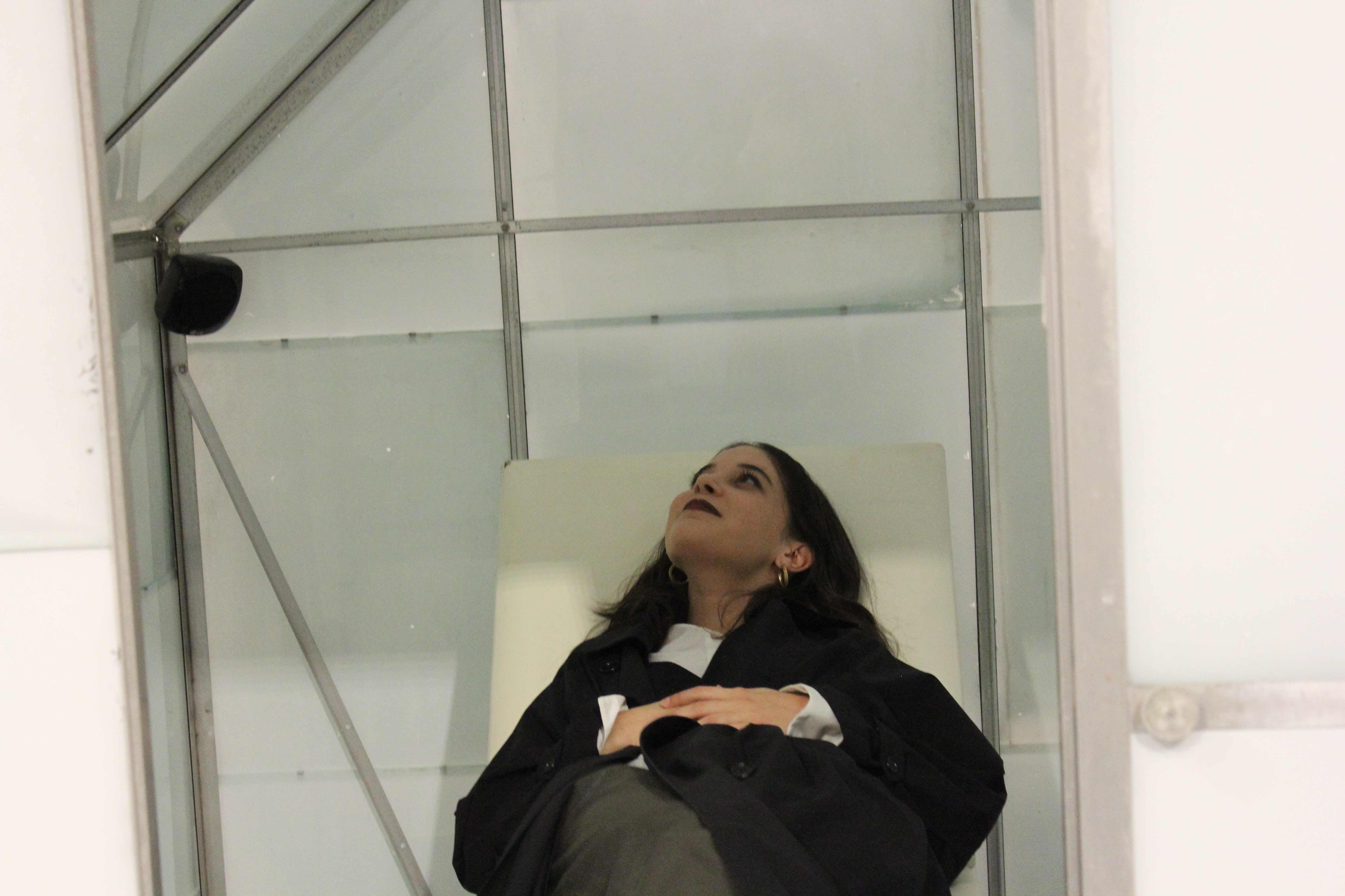By extending the glass facade of the gallery into the inside space, a membrane is created; which encapsulates the visitor and takes away to a different mind-space. A moment of separation from the gallery space with a sea-like surround soundscape created out of artist’s own breathings eases the visitor into a mediative state where the time dissolves and the body lays idle, insubordinate to the worldly demands. Merging an inside situation with a calming, familiar sound of an outside experience (waves). The Inside-out restores and expands the sense of the Self.