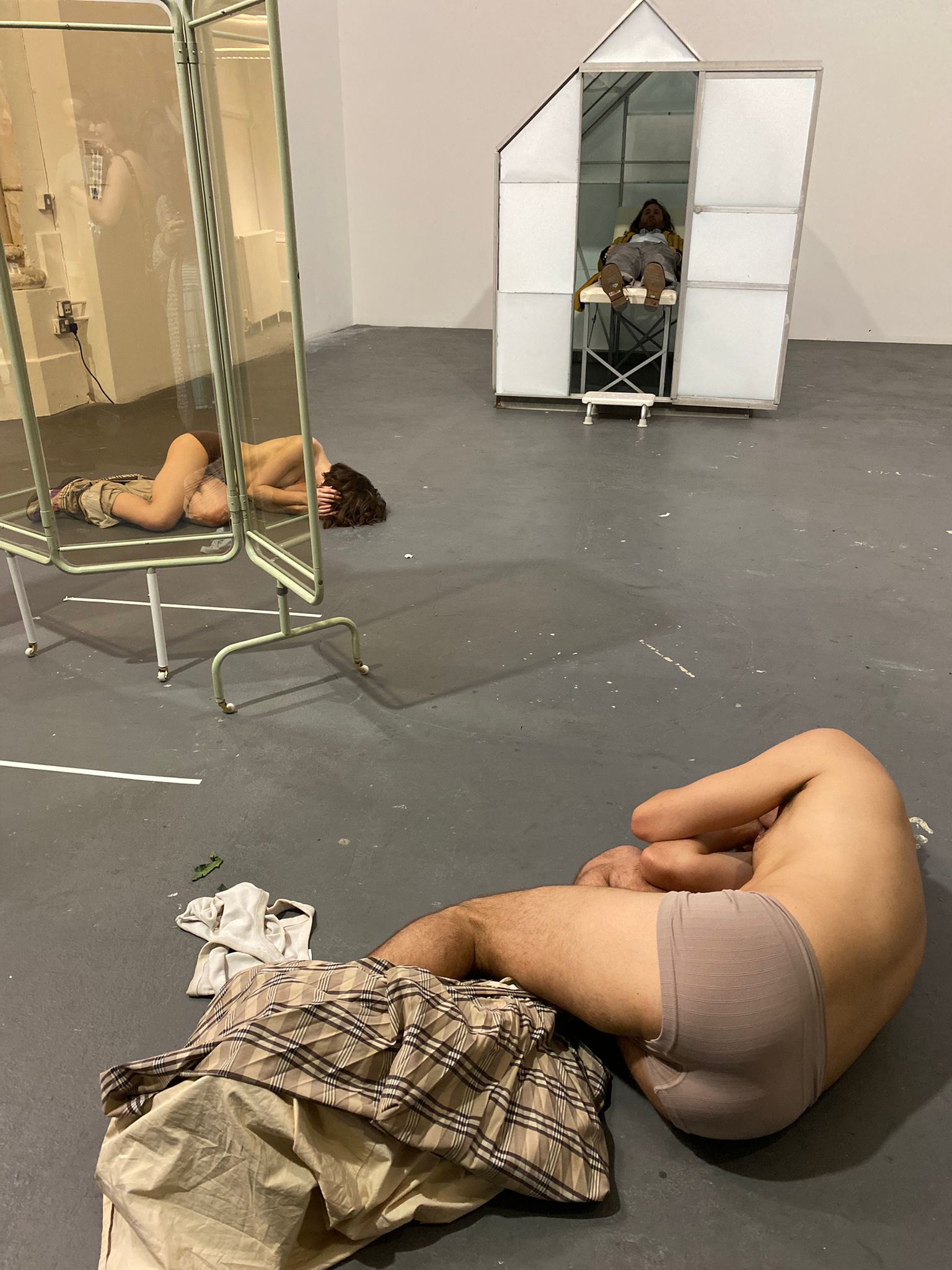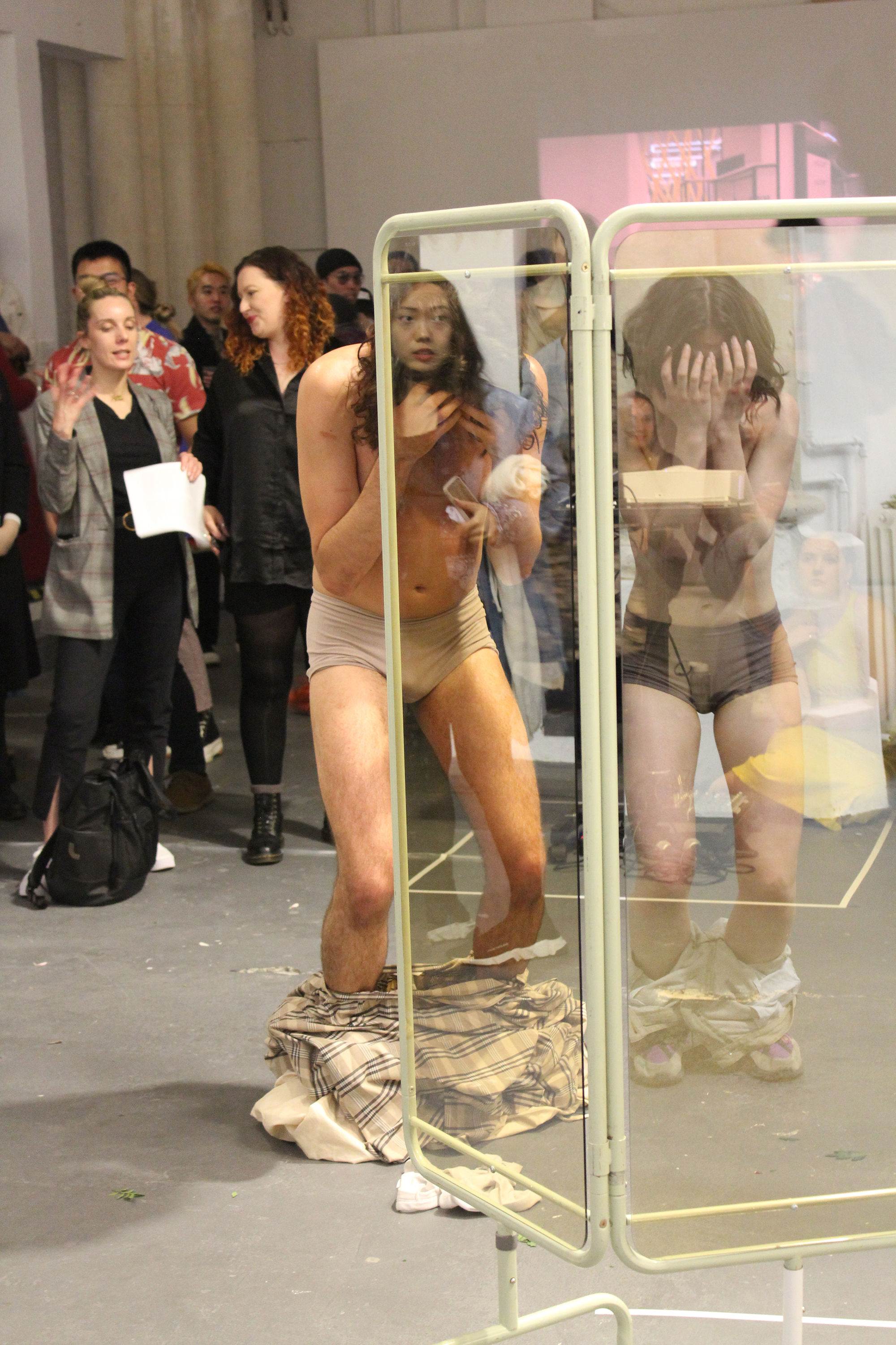 Image left : "Reflecting together" pictured together with the parformance "A room for Us" by Kate Gillies and Amaris Gillies. Pressure Points: Holding bodies as Collateral, group show of BA Curating class at Goldsmiths.