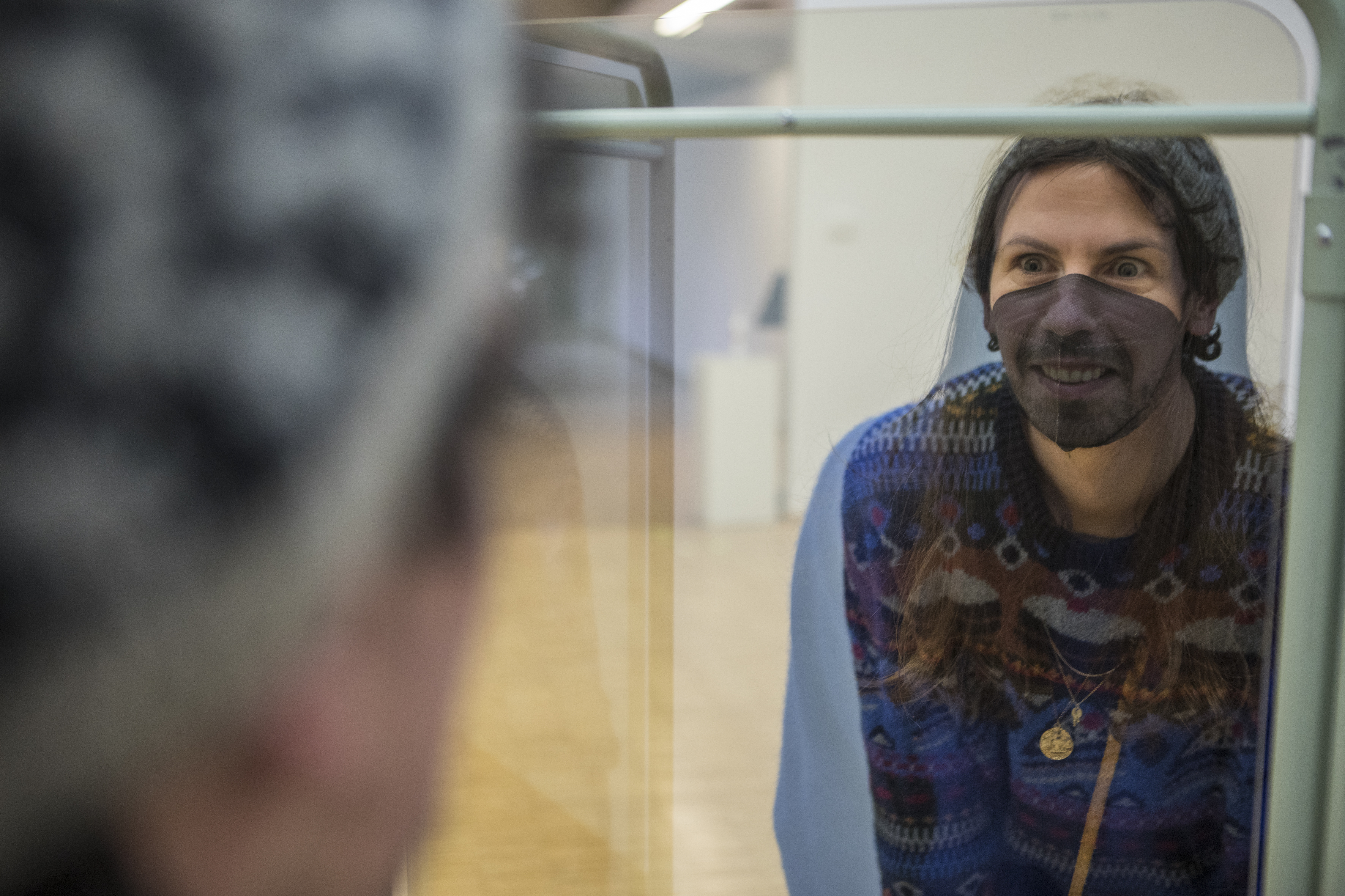Taking the form of a see-through mirror glass medical room divider, the installation becomes a facilitator of visual exchange and collaborative exploration of presence. As a contrast to the separation experience of the room divider and the self-preocupied experience of a mirror, it instead offers a next-level experience of co-existence and connection.The reinvented function disrupts a conventional performance and creates a moment for the awareness of self and others, acting as a reminder to let go of the mind’s pressures.
