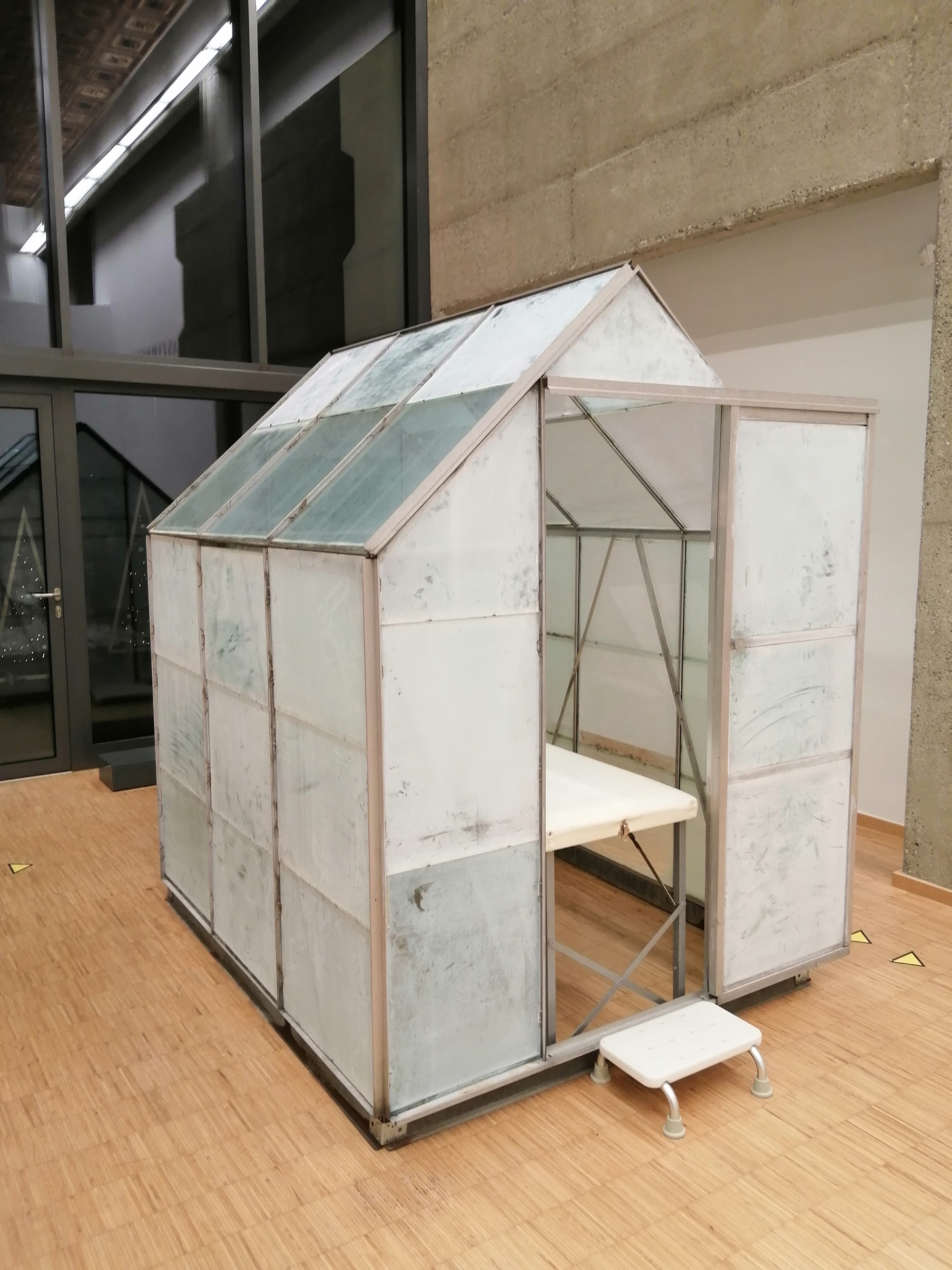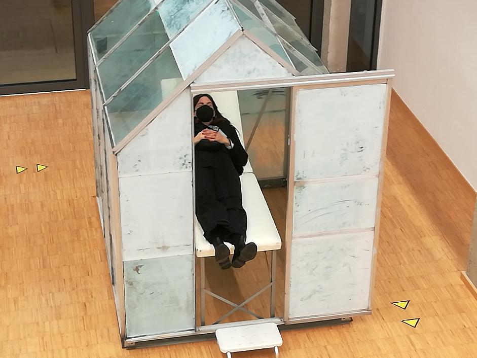 "Reflecting together" is a work in the shape of a medical room divider. Instead of the shades, the divider is made out of sheets of see through mirrors. When visitors stand on both sides simultaneously, they can see themselves and the other at the same time. The room divider that usually separates becomes a connector that encourages exchange, acceptance, and understanding and reminds us not to get lost in the other or vice versa. Finding a collective harmless way out of our unbalanced co-existence.
