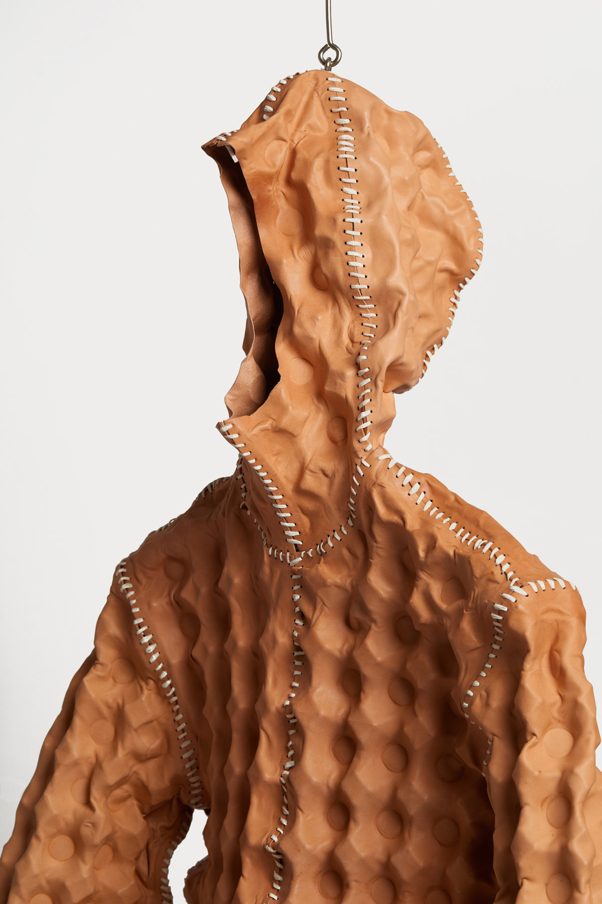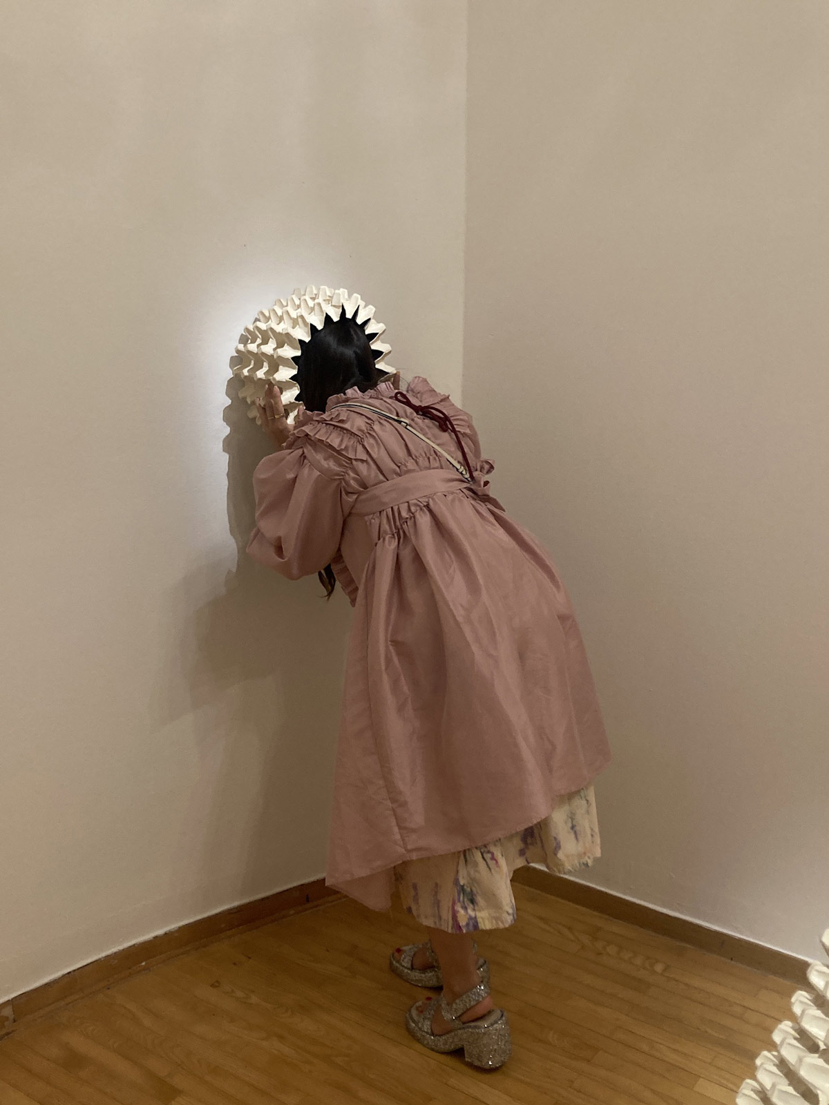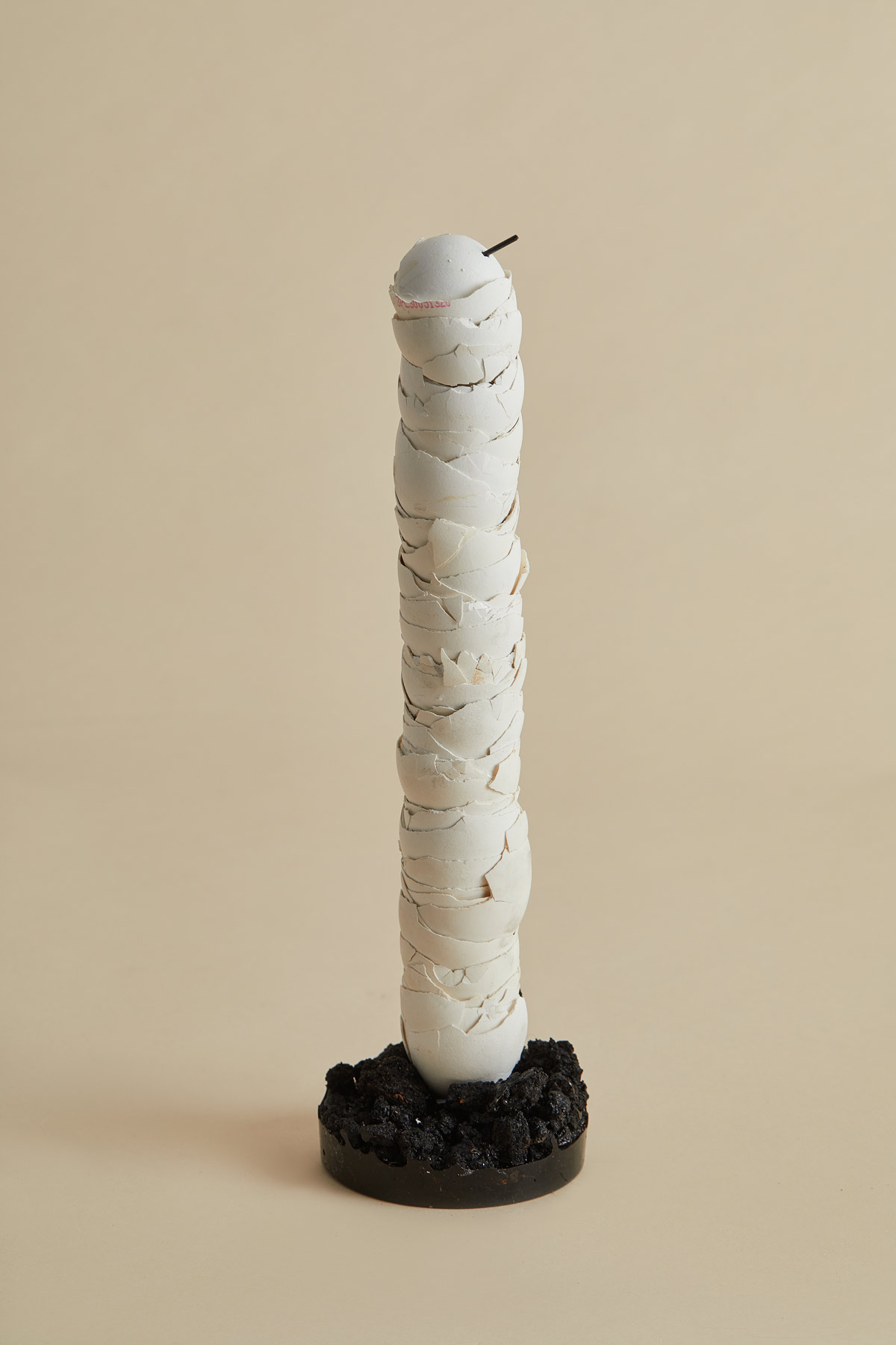 The series “Eggsploration” explores and broadens the idea of fertility beyond mere reproduction, asking, “What is the fertile Self?” and “How is the fertile Self?” In a witty, practical, humble and magical way, it delves into the meaning of fertility, offering a set of tools and protective spaces that provide transition to an attuned, fertile state within oneself. The work is shaped out of symbolic daily materials (found objects) such as eggshells, egg packaging, ladles, bed sheets, and soil, combined with more precious materials such as porcelain powder, leather and metals. Through exploring fertility, it questions the concepts of life, legacy and mortality. The series delves into the soothing idea that we never truly varnish, highlighting our interconnectedness through our bodies turning into one common entity. Are bodies essential to existence? Are we floating consciousness? Where do we go? Where our dreams go? The theme touches upon current socio-economic-political imposing demands, seeks to transcend pre-set pressures and personal or ancestral fears that might come knocking in different shapes or forms. It draws from diverse philosophies, shamanic practices, mythologies, and psychologies, each offering unique perspectives on the nature of being.