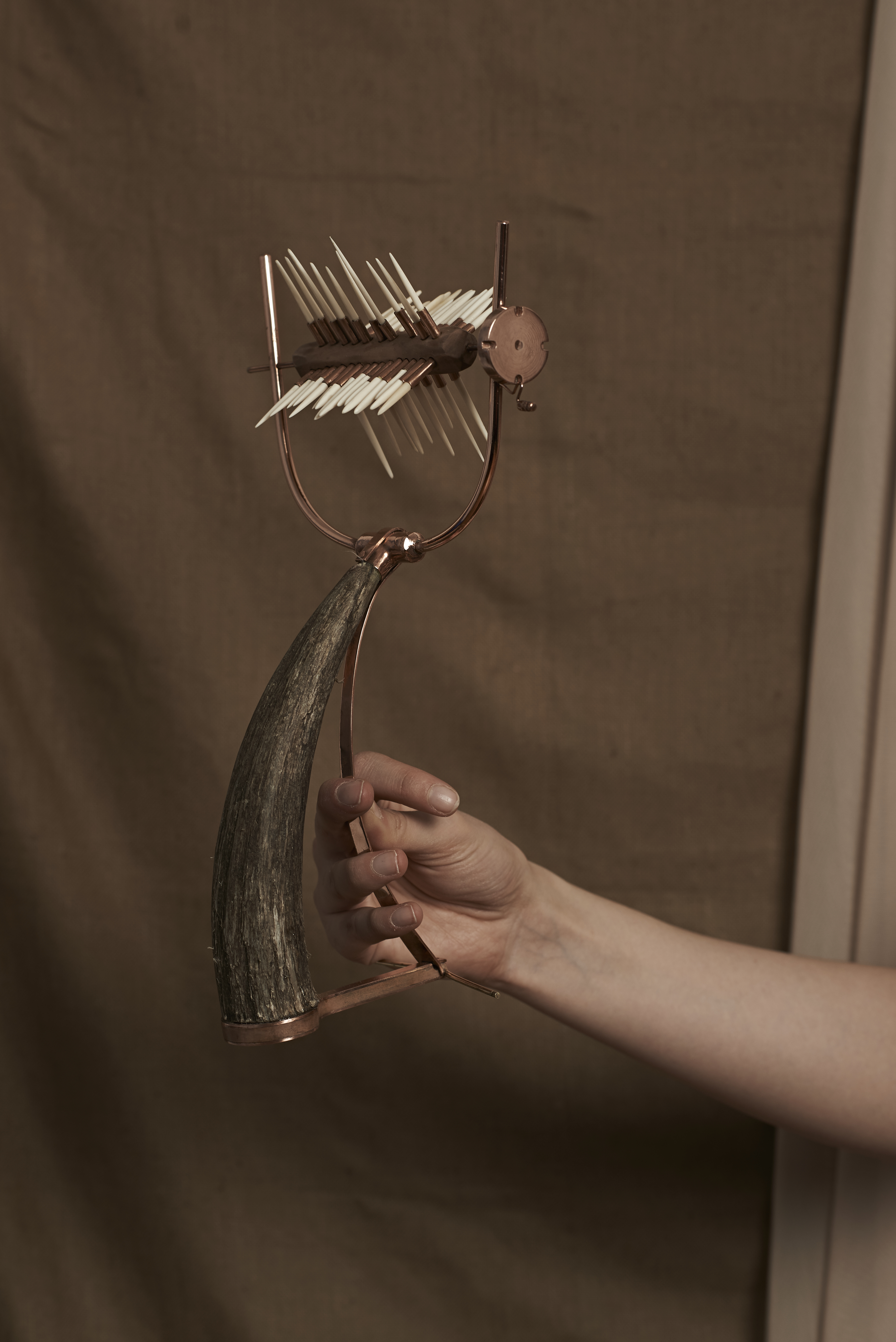 Little by little all the hoarded materials, debris, junk, semi dismantled objects that were acquired through time found their way into luxurious loving grooming devices. There was an AHA! moment when a twig met a banded rod, a tooth from a comb found a rod and a piece of plumbery was joined with a leather strap and a horse hair brush. Suddenly they became alive…