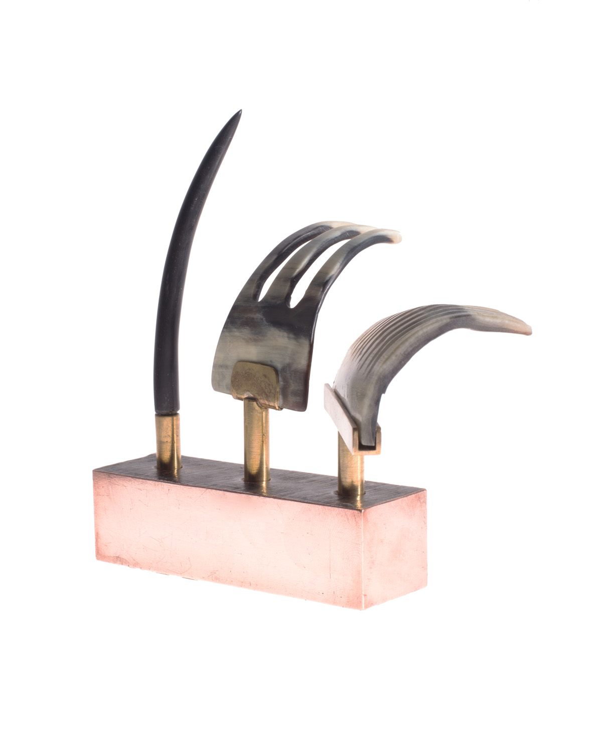 Copper, brass, horn, file, plumbing bits, paper with resin.