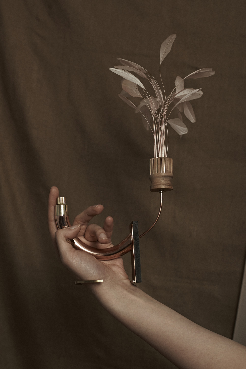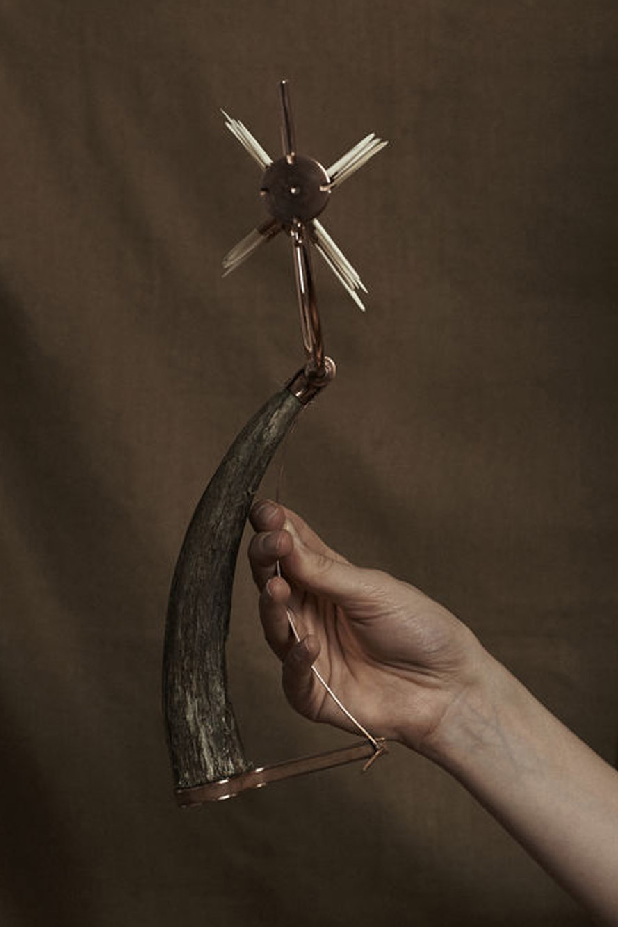 Stripped coque feathers, copper, bras, a remade part of an umbrela out of pear wood.