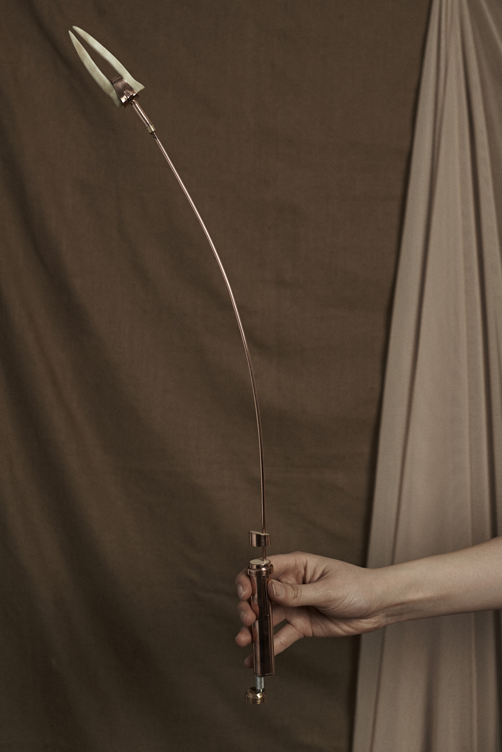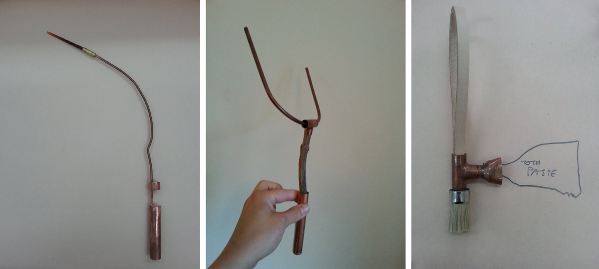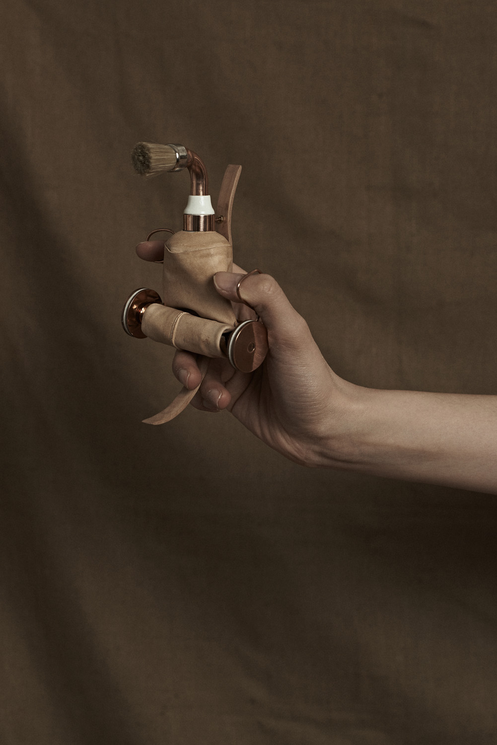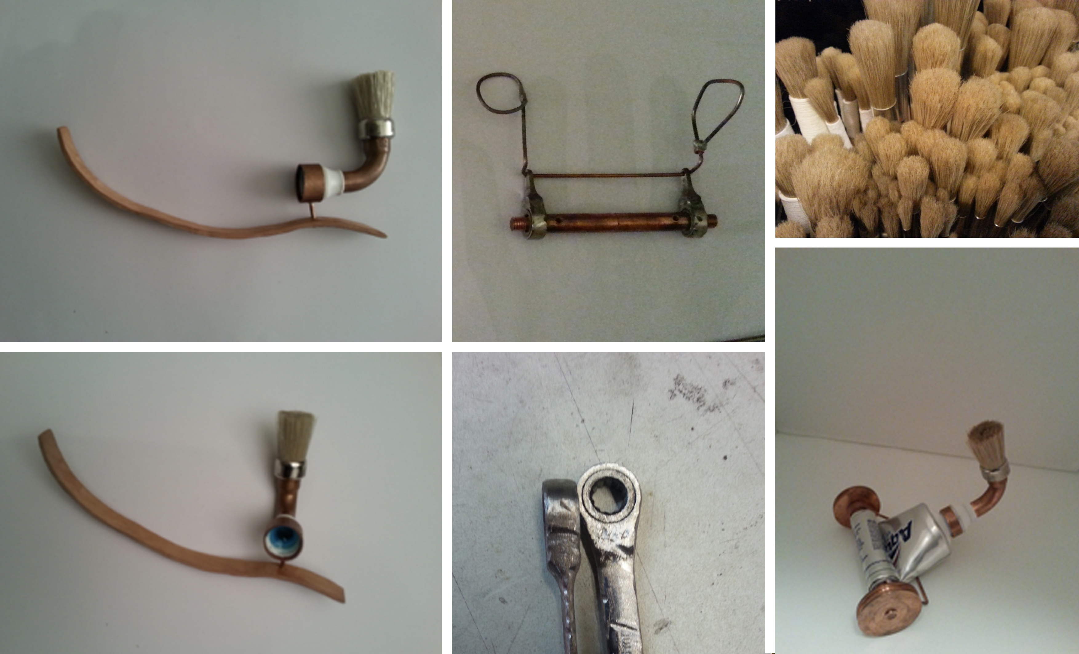 Vege-tanned leather, copper, bras, steel, pear wood, rubber, ABS plastic, Colgate paste, cut ratchet ring spanners, horse hair brush.