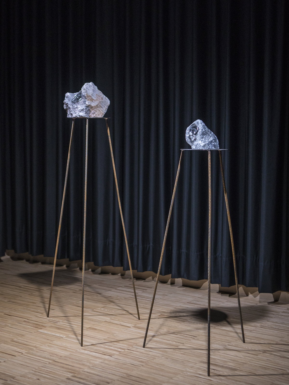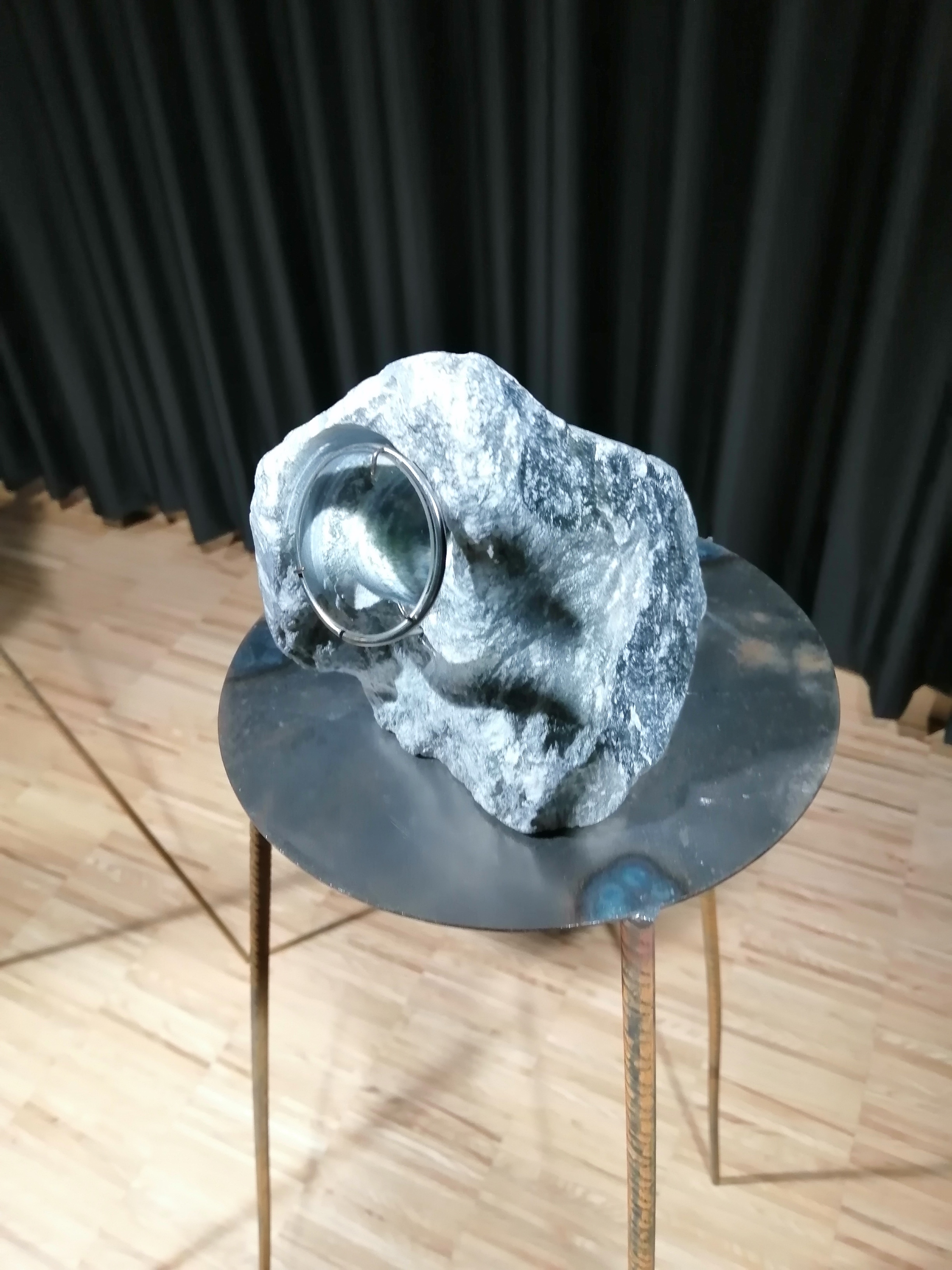 Stone for Self-reflection, object, 2021. Materials : Rock, mirror, magnifying lense, metal.
